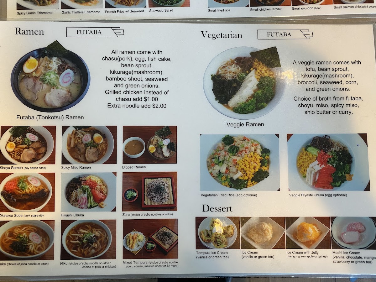 If you're a vegetarian, don't miss the Veggie Ramen or the Veggie Hiyashi Chuka, both bursting with fresh vegetables and savory tofu. With prices ranging from $17.50 to $19.50, Futaba ensures a variety of options that cater to all preferences.
